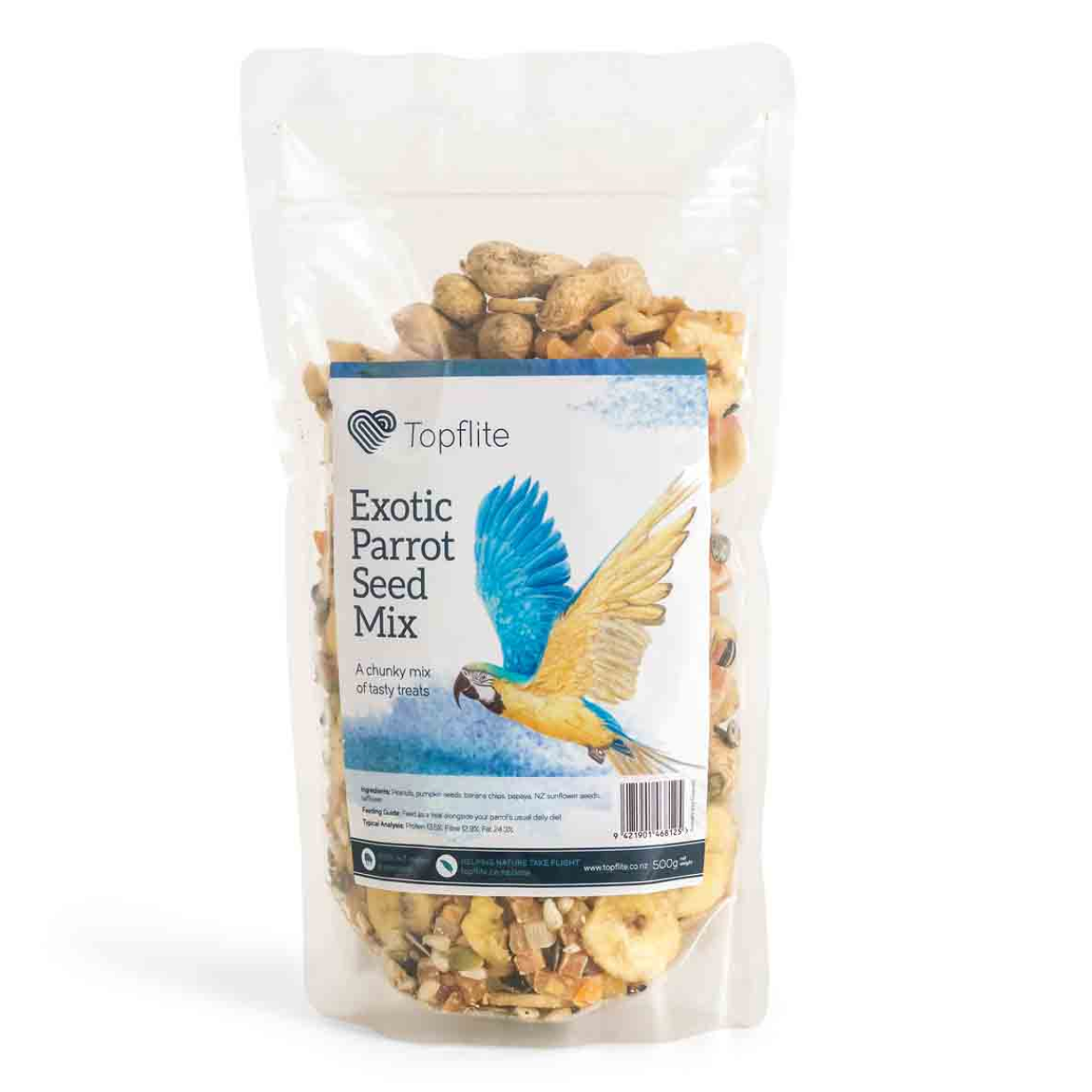 Exotic Parrot Mix - TD is a nutritious, premium blend of seeds, nuts, and fruits packed with essential vitamins and minerals. Perfect for stimulating natural behavior, this mix includes a variety of ingredients from small sunflowers to large banana chips to keep your parrot entertained and engaged. Treat your feathered friend to the best!